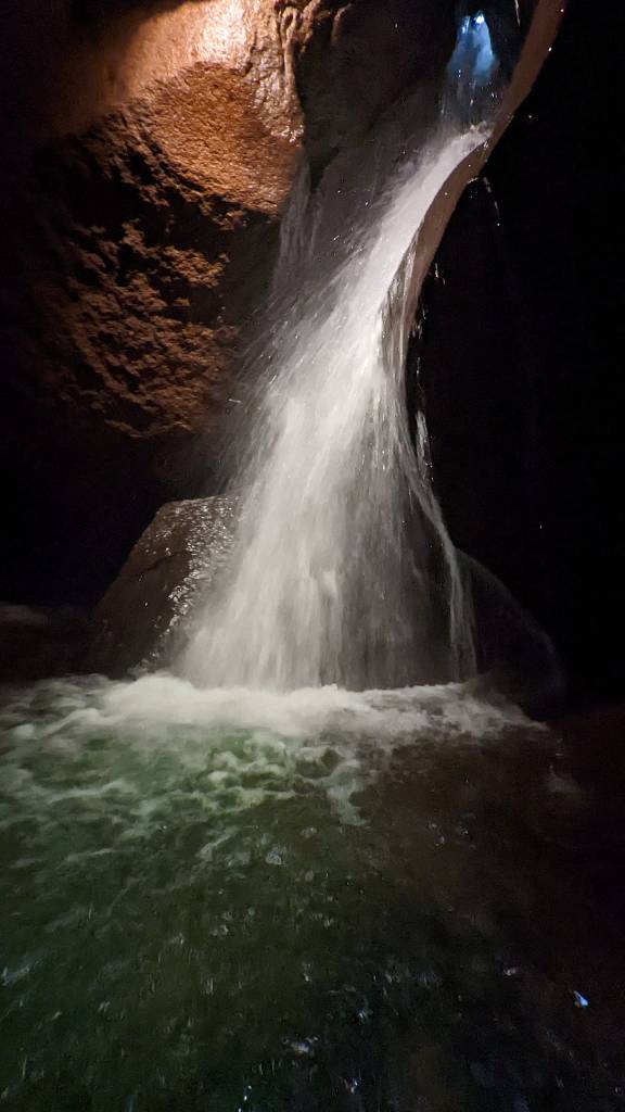 The rocks were slick with water and a residue of mud and slime. Carefully, I slithered on. Not too far away now was a small beam of sunlight that was enough to softly illuminate the cave. The roar of the waterwall was overwhelming as it splashed upon my face, escaping the pool below it. Out from under the wall of rock, I slowly gathered myself to my hands and knees. Witness such intimate, natural beauty and magick overwhelmed me. For this cave is often closed due to flooding, and in this moment, I am here with a grateful and fully open heart.