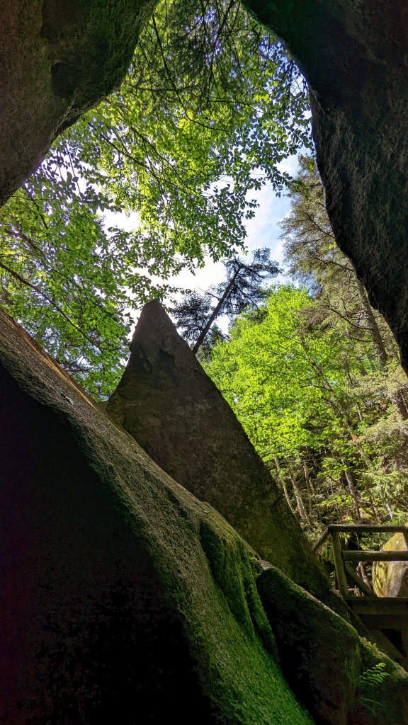 Reaching the bottom of the gorge humbled me. Standing among the stone giants, I felt so small. Their immense physical form cast long shadows all around me. The thin, needle like fingers of light pointed out the steps in the pathway, splashing me with the warmth from the surface world above. These guardians, these sentient beings, have witnessed life for over thousands of years. They stand tall, firmly in place, offering themselves to the land and creatures around them. Only the sheer force of Mother Nature herself moved them thousands of years before me. There is a lot to learn from these steadfast keepers of earth. I remind myself that we both contain the minerals of earth and that I am only here in this body for a mere blink of an eye. How do I respond in the face of adversity? Am I able to solidly stand in my shape and form to guard against harm and the storms within and around me? No, not always. Can I grow and thrive like the massive trees and spongy moss that root and grow in the spaces around them because of their steadfastness? It is my hope to do so. I offer my respect to the granite giants as I carefully make my way around them, absorbing the lessons they silently teach.